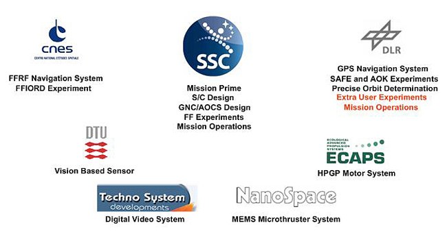The project structure of the PRISMA mission initiated by the Swedish National Space Board (SNSB) is very international, including partners from all across Europe. As the project leader, the Swedish Space Corporation (SSC) is the spacecraft manufacturer and the provider of onboard software and experiment specific Guidance, Navigation and Control (GNC) flight software. Each of the project partners, being experimenters at the same time, has provided their own hardware and software for technology demonstrations during specific experiment slots.