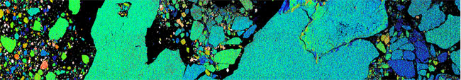 From the rotation angle and the cyclic phase patterns, we observe that some of the ice floes spin in opposite directions (yellow-orange-red or blue-violet on the rotation angle image) and that smaller ice floes have a tendency to move faster. The areas close to becoming unstable can be identified immediately. This is visible in the left half of the image. Inside the large, stable ice surface, we see a colour pattern that is distinctly different from its surroundings. On the bottom centre left of the image, we can also see an ice floe that is just starting to break off from its larger companion.