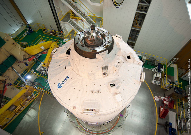 ATV-3 ‘Edoardo Amaldi’ on its launcher, just prior to the installation of the fairing, showing the active docking mechanism.