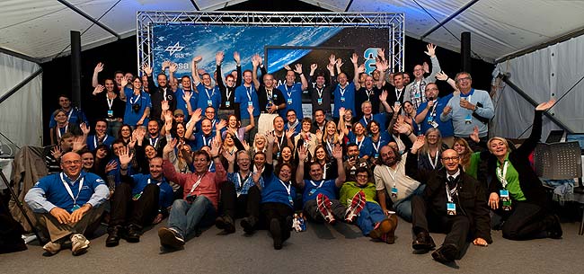 Euphoric mood during the group photo as more and more astronauts entered the SpaceTweetup marquee and spontaneously joined the participants (Video: Arvid Bux)