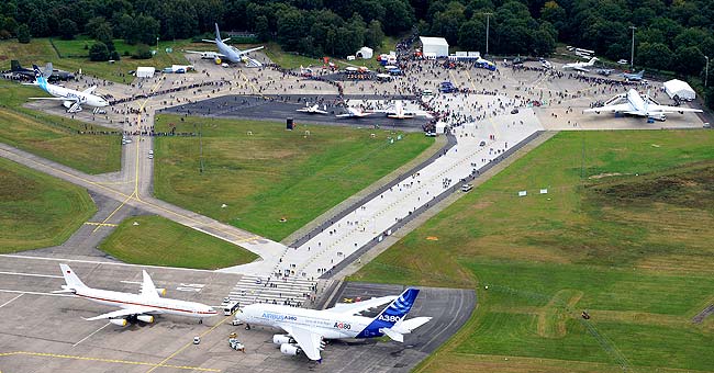On 'Zulu Stand', visitors to German Aerospace Day could view some unusual aircraft. In the foreground, an Airbus A380 faces an Airbus A340 from the Special Air Mission Wing of the Bundeswehr (German armed forces). At the rear and to the left is the Zero-G parabolic aircraft; to the right, the SOFIA airborne observatory SOFIA. (Credit: DLR)