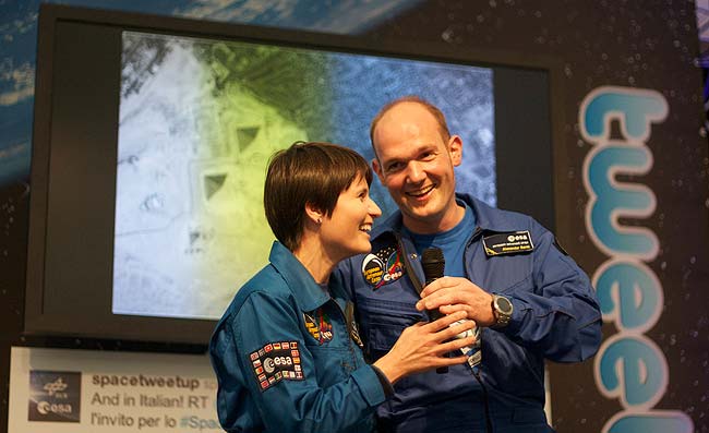 Above: The European Space Agency astronauts Samantha Cristoferetti and Alexander Gerst (Credit: Simona Forti). Below, right: SpaceTweetup presenter Andreas Schepers (Credit: Simon Bierwald)