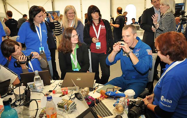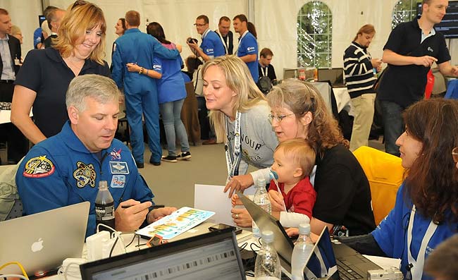 The highlight of the SpaceTweetup was probably the repeated visits by astronauts to the Tweetup marquee. In total we had 11 European and American astronauts on site; both the crews of ISS Expedition 26/27 and STS-134, as well as other ESA astronauts, joined in. The SpaceTweeps' euphoria reached a peak during the group photo with all 60 participants and the SpaceTweetup organisers, when a large number of the astronauts unexpectedly came to the marquee and spontaneously joined in with the group photo.