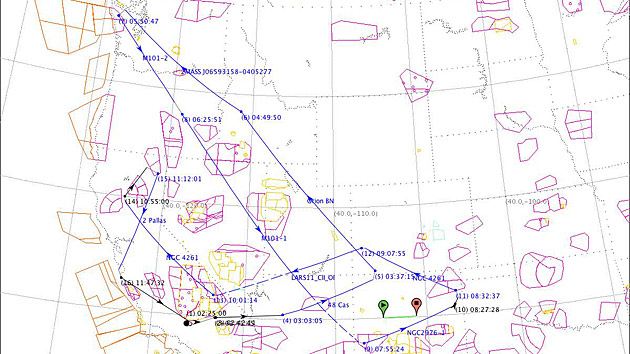 The aircraft took off as scheduled at 19:28. The scientists completed final preparations during the time until the telescope door was opened. The programs for data pre-evaluation were loaded and the automatic scripts given a last check while the operators were busy setting up the telescope. It took three flight 'legs' to reach our position for the first observations. As is the case for aviation as a whole, the term 'leg' in relation to SOFIA describes each section of the route until the next turning point. Take-off and landing are also described as and counted as 'legs'. The schedule for this flight listed 16 legs, nine of which would be used for scientific observations.