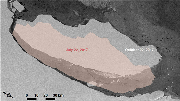 Close examination of satellite image sequences from the last two months reveals the striking events unfolding there. Remember, the 5800 square kilometre iceberg is seven times the size of Berlin and is permanently moving. The iceberg has collided repeatedly with the ice shelf, dislodging smaller pieces of ice.