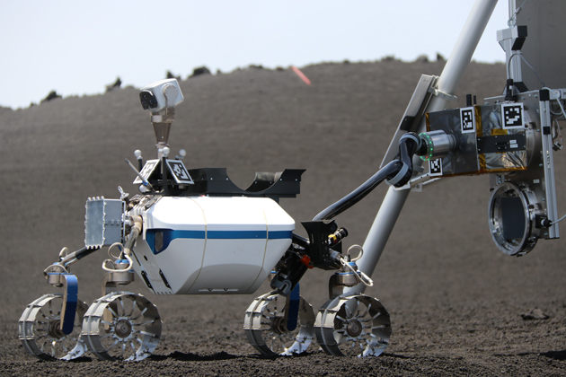 The Rover stops repeatedly during its mission – almost like a thoughtful person. Ultimately, this is precisely what is going on in its computerised brain. To drive safely, it updates the map with each glance at its surroundings. And the fact that it is not in a laboratory, but on a real scenario on Mount Etna, does not make things easier: the weight of the sensor units, for instance, would be negligible on the Moon – but their three kilograms in Earth’s gravity pose quite a challenge. The terrestrial winds that swirl repeatedly around the Rover, pressing against its arm, also cost the vehicle a lot of energy – a problem that would not exist on the wind-free Moon.
