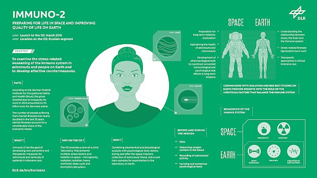 On Earth, healthy and critically ill people, in particular, suffer from similar ailments caused by the same stress factors, having a considerable socioeconomic impact. In 2015, the economic losses caused by the incapacity to work – often due to mental illness – amounted to 113 billion euro for Germany alone. In order to better understand stress-related illnesses and help scientists develop effective countermeasures, the Immuno-2 experiment on the International Space Station (ISS) is examining microgravity, radiation, isolation, heavy workloads and disruption of sleep rhythms as stress factors affecting the immune system. Combining biochemical analysis with psychological tests, astronauts will provide blood, saliva and hair samples to assess their hormone and stress levels before, during and after their missions. They will also undergo electroencephalography (EEG) tests to monitor brain activity.