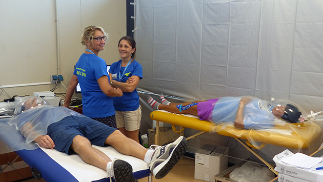 Tucked away in the rear section of the MASF room, screened off from the other areas by partition walls, this station uses indirect calorimetry to determine the resting metabolic rate by measuring oxygen consumption and carbon dioxide emission. For this purpose, the participants lie quietly beneath a canopy hood for 30 minutes. The examination is explained to two participants resting on recliners, and they are prepared for the tests at the same time. During measurement, Natia and Irmi make sure that the participants stay relaxed, but without falling asleep, as the resting metabolic rate drops during sleep, which would distort the findings of the test. The athletes occasionally have trouble staying awake at this station, as their sometimes advanced age, the rigours of the competition and the high Spanish temperatures can be quite a burden. The investigators wake them gently if they do happen to nod off. Afterwards they are served breakfast by the team to be fortified for the day, which they are very happy to accept.