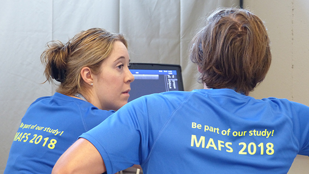 The team has prepared several stations with different examination focuses to obtain the data on muscles, body composition, heart, circulation, metabolism and life circumstances that is relevant for the MAFS study. The first step is to record the participants’s data, explain the study, weigh and and measure them.