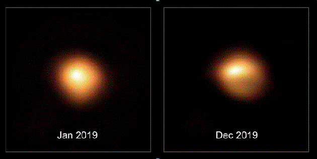Curiosity is high, a lot has been said and written, but nobody knows what is really happening with the star Betelgeuse. Its luminosity has decreased drastically over the last five months. Now, there is speculation that the star could soon become a supernova – the explosion at the end of a large celestial body's life. A team led by Miguel Montargès of KU Leuven in Belgium has compared two images of Betelgeuse acquired by the European Southern Observatory's (ESO) Very Large Telescope (VLT) in January and December 2019 and has discovered something surprising – it is not only Betelgeuse's brightness that has changed, but also its shape.