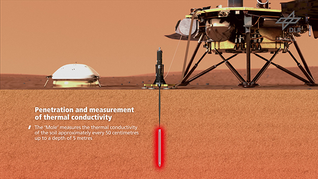 For the first time since the astronaut mission Apollo 17 in 1972, heat flow measurements will be carried out on another celestial body using a drilling mechanism. The main aim of the experiment is to be able to determine the thermal state of the interior of Mars using heat flow measurements taken beneath the surface. Models of Mars’ formation, chemical composition and inner structure can be checked and refined on the basis of this data. The measurements from Mars can also be used to draw conclusions about Earth’s early development.