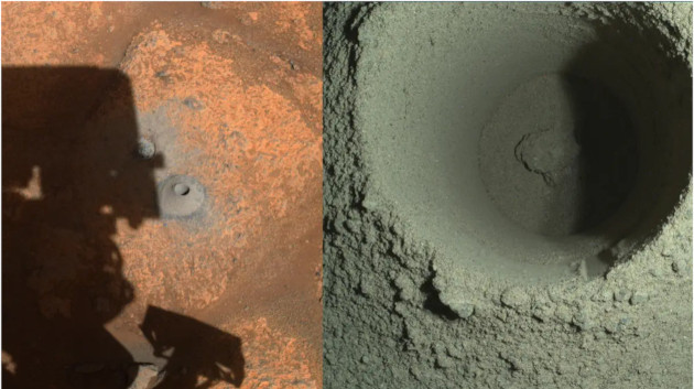 My partner, a scientist who is also involved in the mission, messages me with some welcome news: "We have a hole!" The data confirm that the core bit has drilled a seven-centimetre-deep hole, as planned. The images from Mastcam-Z, the Perseverance rover's main 'eyes' near the top of the mast, which I work on, show us the bore hole and missing drilled rock as expected. It's all crystal clear. Around it lies a conical heap of fine drilling dust.