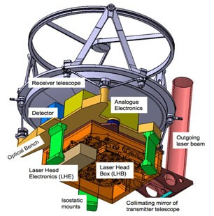 The assemblies of the Transceiver Unit were arranged on a stable optical bench: At the very top is the telescope, below it the detector with its detector-related electronics and at the very bottom the laser, whose laser beam was to be emitted towards the lunar surface via a deflecting mirror.