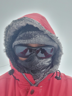 Next, we recalibrate the force sensors, as the new systems have changed the weight of the probe. To do this, the probe is first calibrated to zero while lying down and then suspended from the crane and calibrated with the force of its weight. Unfortunately, the bad weather forces us to take another break of one and a half days. The wind speeds reach over 40 knots (approximately 74 kilometres per hour), the outside temperature is minus 10 degrees Celsius, and the snow is drifting very heavily. Visibility is severely limited as a result, and working outside the station is not possible. The cold wind and snow sting the skin even when walking short distances.