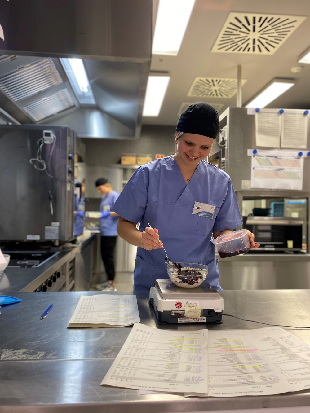 Controlling food inventory, so that all ingredients are available according to the previously calculated nutrient intake, plays an important role in the catering. The food is weighed to the nearest gram, and to avoid water loss from cooking, the components are pre-cooked and then weighed cold. Meals are then heated before serving.