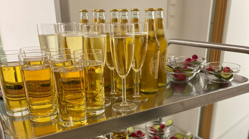 The test subjects were able to toast this special occasion with non-alcoholic sparkling wine, non-alcoholic beer (Kölsch, naturally, as we are in Cologne) or apple juice spritzer, and everyone enjoyed a fun evening in the :envihab lecture hall. Of course, the celebration only began after all the important tests and experiments of the day had been completed, along with the standardised evening meal.