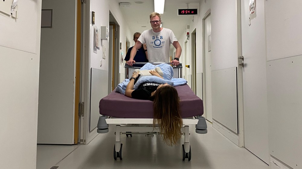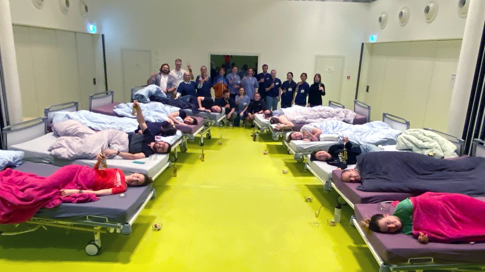 Getting all the test subjects together in their beds in the lecture hall takes some preparation. First, all the chairs and tables had to be removed to make room. Then, all the participants were brought one by one into the lecture hall and placed so that they could see both the DLR show host for the evening, Nico, and each other. The main event was playing a quiz together with their own team, which involved general knowledge and activities in a lying-down position.