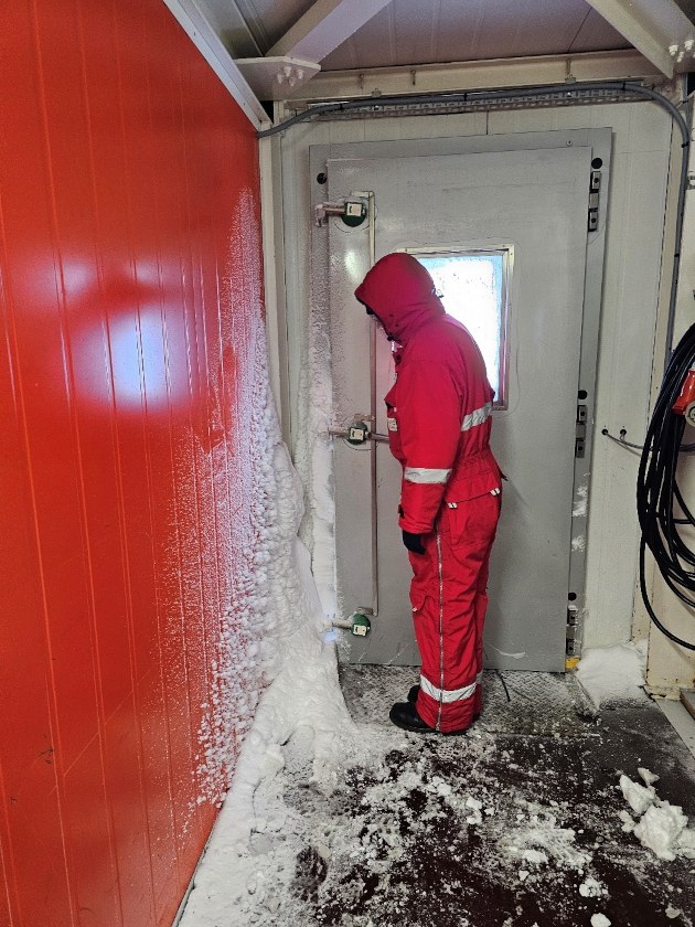 With the help of a lift truck, we push the probe into the station's so-called 'gallery'. This area is the weather-protected space between the inner structure of the container and its outer shell. As a rule, this space is used for additional storage, as well as a work and recreation area. In the coming weeks, we will be able to work on the probe outside regardless of the harsh weather. We will install its updated gearbox and test and calibrate all of its subsystems.