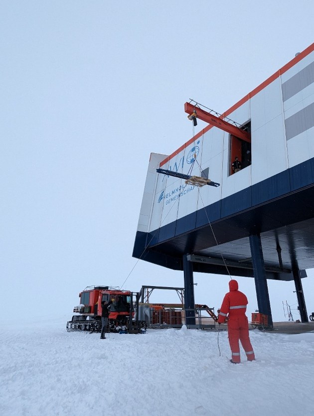 Today's weather is unpleasant, with light snow drifts and wind speeds of up to 20 knots (37 kilometres per hour). And tomorrow is expected to be even worse. Before then, we plan to bring the TRIPLE-IceCraft melting probe to Neumayer Station III. To do this, we will remove the probe from the container and place it on a snow crawler that will transport it to the station.