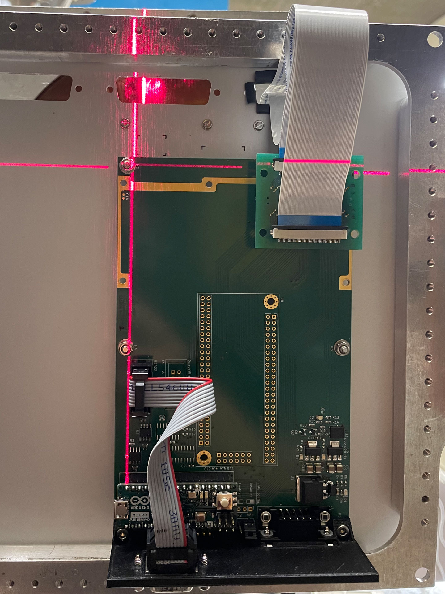 The test hardware is aligned using a laser marker so that the radiation hits the board in the right place.