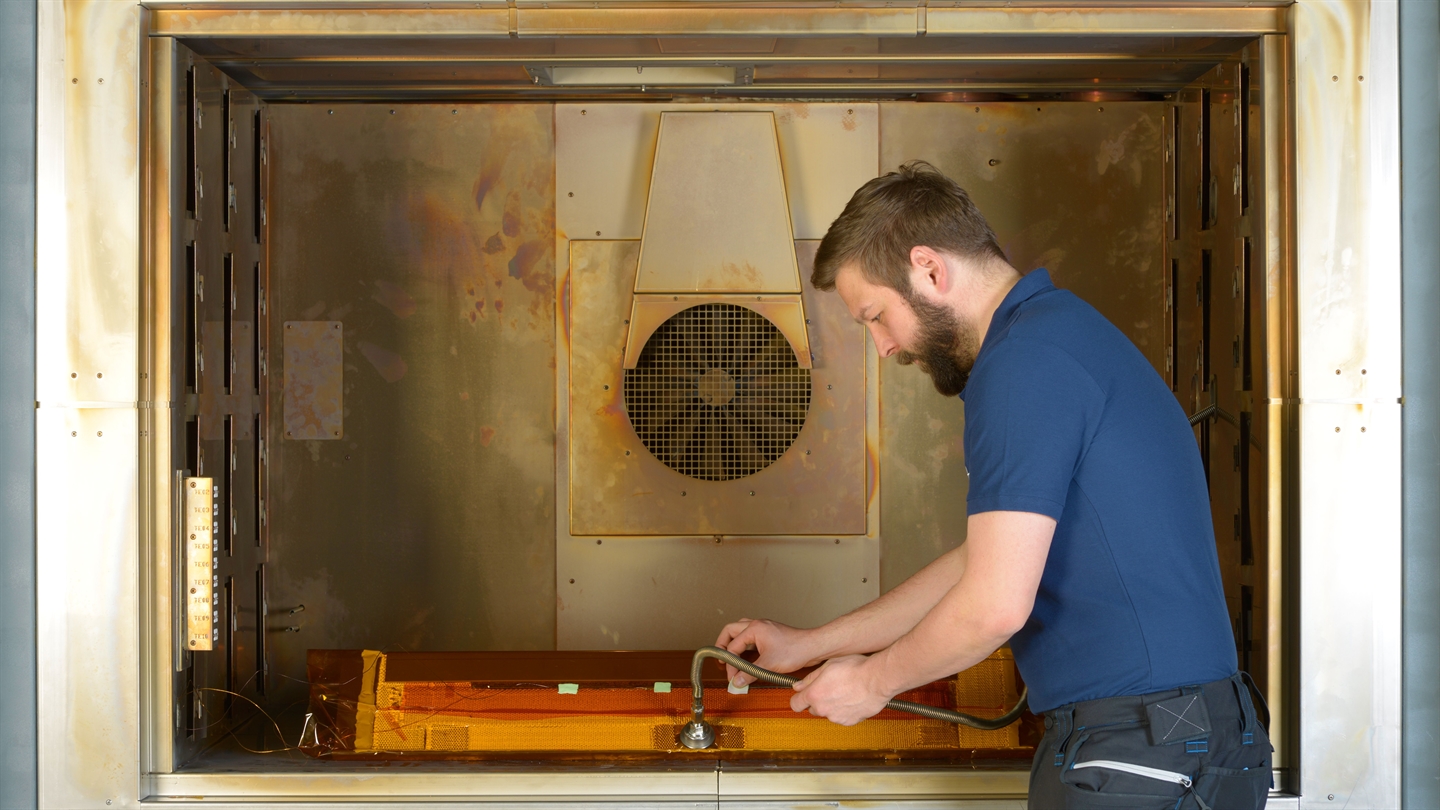 In the small furnace, preliminary tests and feasibility studies are typically carried out on a scaled basis (here: vacuum consolidation of angular elements)