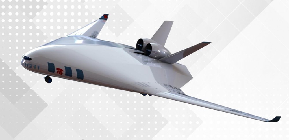 The H211 is a blended-wing-body aircraft powered by liquid hydrogen. The central wing area is used efficiently through the integration of multiple cabin tubes and cylindrical hydrogen tanks. The combination of high-bypass turboprop engines and overhead mounting reduces noise emissions.