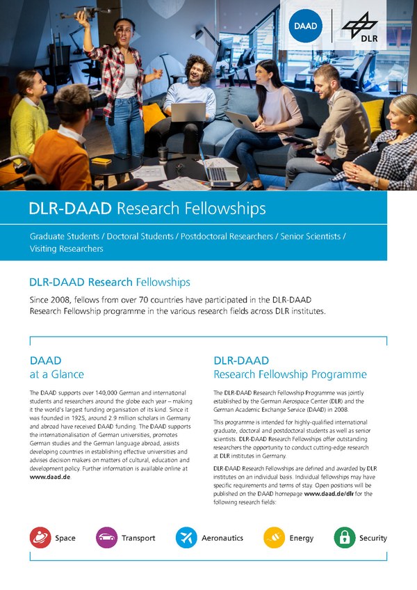If your application is successful, our institutes and facilities will support your stay with a DLR-DAAD scholarship – in cooperation with the German Academic Exchange Service (Deutscher Akademischer Austauschdienst; DAAD). The DLR-DAAD Research Fellowships Programme enables excellent aspiring or experienced international scientists to spend a period of time researching at one of our institutes or facilities as a graduate/master’s student, doctoral candidate, postdoc or senior scientist..