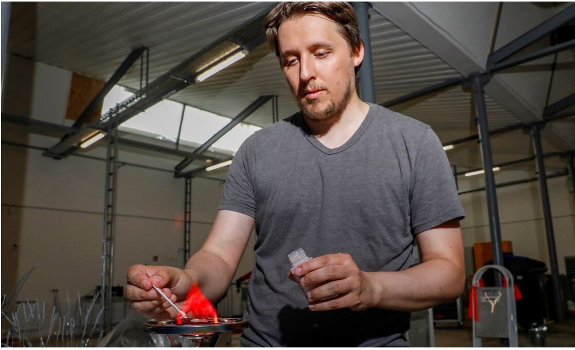 Sven Mehlhose experiments with fire. The strontium nitrate makes the flame red.