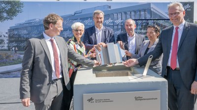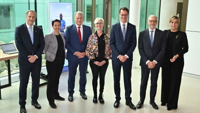 From left: Alexander Dobrindt, Member of the German Bundestag; Friedrich Merz, Member of the German Bundestag; Nils Sparwasser, Head of the DLR Science Communication and Visualisation Department. Behind them, from left: Michael Kießling, Member of the German Bundestag; Anke Pagels-Kerp, DLR Divisional Board Member for Space; Florian Hahn, Member of the German Bundestag; and Klaus Hamacher, Deputy Chair of the DLR Executive Board.
