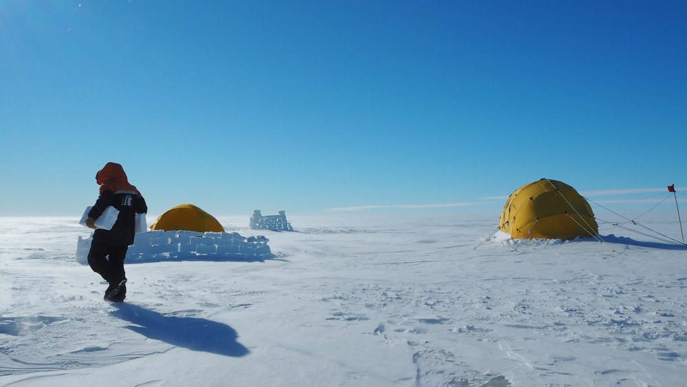 When resting in our tents the constant ruffle of the blown snow is only interrupted by the creaking of the bending ice bellow.