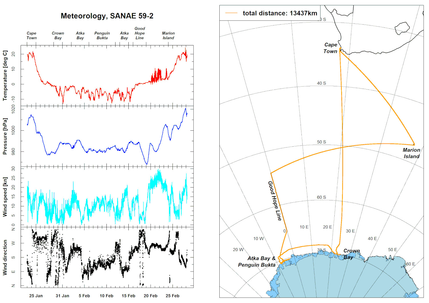 Meteorological conditions and route of S.A. Agulhas II from Cape Town via Crown Bay, Atka Bay and Penguin Bukta, along the Good Hope Line and via Marion Island back to Cape Town.