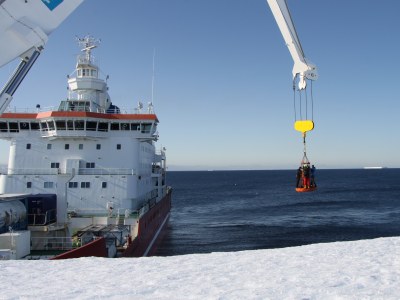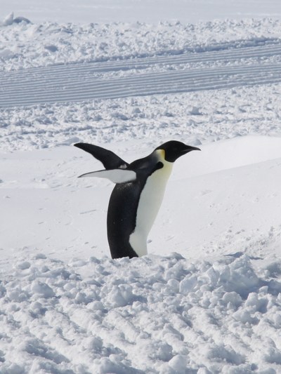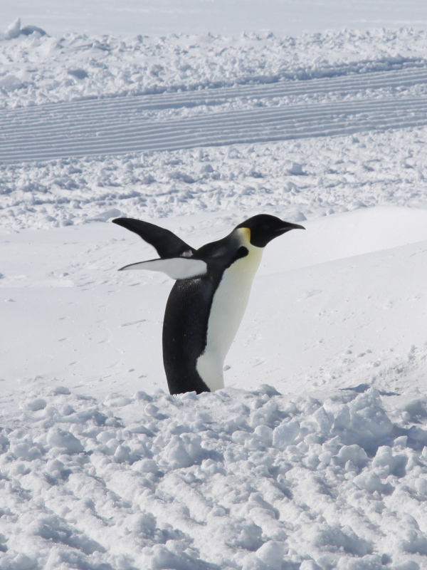 Der geplante Landgang und die Besichtigung der Neumayer-Station III konnten am nächsten Tag bei bestem Wetter beginnen. ‚Gut festhalten!‘, hieß er es zunächst beim Übersetzen mit dem Transportkorb vom Schiff auf das Schelfeis. In gut 15 m Höhe schwebte man in Viererteams über dunkelblaues Wasser und die Schelfeiskante dem Festland entgegen, wo uns ein Teil der Stationsbesatzung herzlich in Empfang nahm. Warm eingepackt ging es dann auf einem Schlitten ca. 1,5 Stunden lang im frischen Südwestwind und über eine Entfernung von 19,5 km der Neumayer-Station III entgegen. Dort angekommen begrüßte uns der Stationsleiter zu unserem ausgiebigen Stationsrundgang. Das landestypische Begrüßungskomitee bestand zudem aus einem von zwei verbliebenen Kaiserpinguinen, die nicht wie ihre Artgenossen die Atka Bucht über die kurze Sommerzeit verlassen wollten.