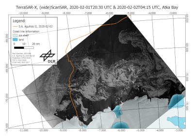 Die Überfahrt von der Eisschelf-Formation Dog’s Head zur Atka-Bucht führte entlang 68°30’S und damit nördlich der Meereisgrenze direkt Richtung Westen. Für die Fahrt nach Süden am 02.02.2020 durch den Meereisgürtel wurden geeignete TerraSAR-X-Aufnahmen bereitgestellt, die auch in diesem Fall wieder eine günstige Route zu unserem Ziel, dem Ekström-Schelfeis, vorgaben.