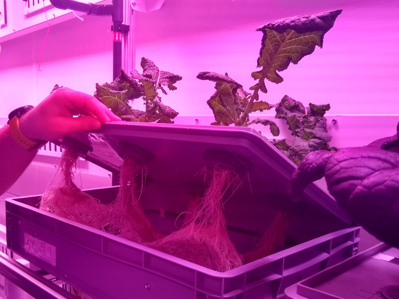 Auf dem Rückweg zurück zur Station konnten wir auch noch das vom DLR-Institut für Raumfahrtsysteme geleitete Projekt EDEN-ISS besichtigen. Unter den antarktischen Extrembedingungen wird hier der Anbau von Gemüse für zukünftige Raumfahrtmissionen erprobt. Kollege Paul Zabel vom DLR-Standort in Bremen führt seit Weihnachten Untersuchungen und Wartungsarbeiten im Antarktis-Gewächshaus durch. Im künstlichen Licht des Gewächshauses erklärte er uns alles Wissenswerte über den Kräuter- und Gemüseanbau, der nur mit dem gezielten Einsatz einer Nährlösung und ohne Erde auskommt.