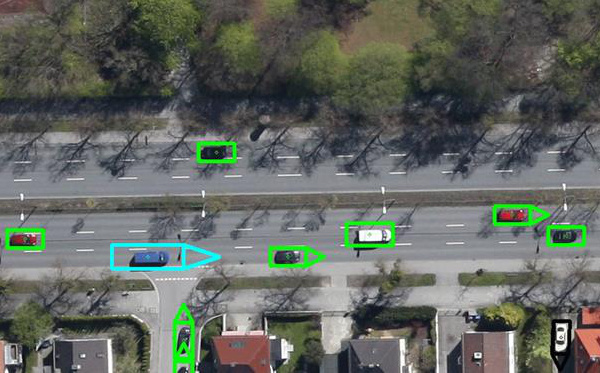 Example from the dataset: The annotated vehicles are illustrated by bounding boxes, where the green and blue-green colors indicate different vehicle types.