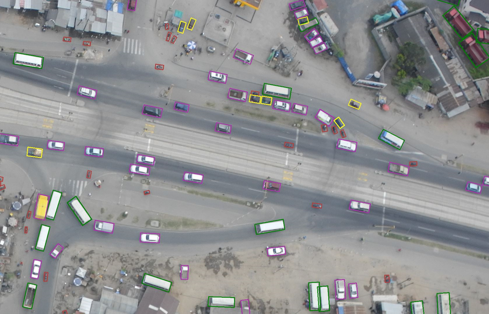 Example from the dataset: The vehicles are annotated as polygons with four points (with the first point being on the left front), where different colors of the polygons indicate different classes.
