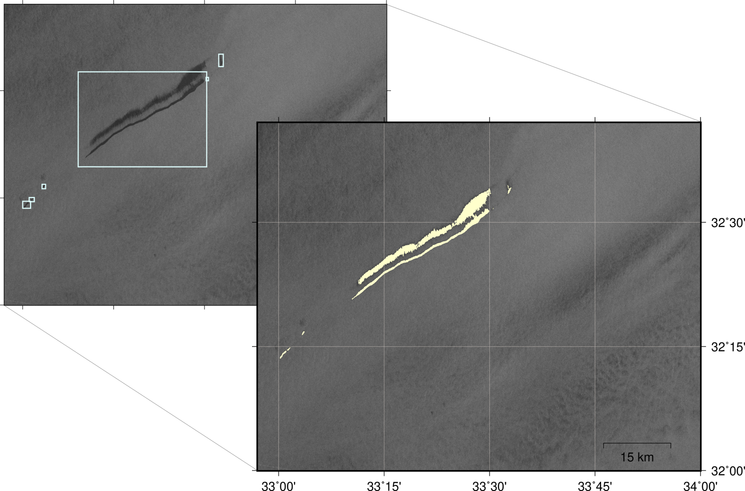 Oil slicks automatically detected in radar satellite data.