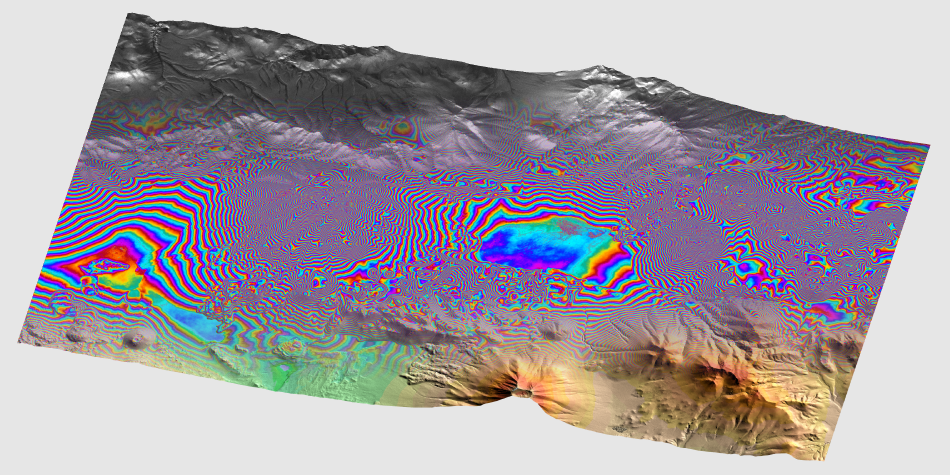 As an example, the above figure depicts the essential steps of the interferometric processing procedure as developed for the TanDEM-X mission. By focusing the holographically recorded radar echo, a sharp image can be obtained of the radar reflectivity of the earth’s surface. In addition to signal strength, shown as grey values in the upper left part of the figure, these images also contain very precise distance information in the form of phase angles. From the difference in phases between two SAR images which have been recorded from slightly different perspectives an interferogram is produced, shown in the central part of the figure as a pattern of colored stripes. After resolving phase ambiguities and knowing the exact recording geometry, it can be used to generate a digital elevation model of the earth’s surface, as indicated in the lower right colored portion of the figure.