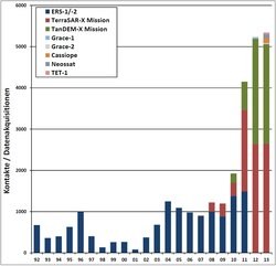 GARS O’Higgins has been operated since 1991 as a satellite data receiving station. During the first years of operation it was used on a campaign basis during the Antarctic summer months. In a total of 28 campaigns, primarily in support of the ERS missions, 5000 data takes were recorded with over 99 % station availability. In 2010 the new TanDEM mission required a high number of satellite contacts year-round over the Antarctic, which led to the expansion of GARS O‘Higgins to provide continuous 24h/7d/365d operations. The graph at right shows the number of contacts with various satellites from 1991 to 2013. All contact types are included, both those involving reception of earth observation data and contacts in support of Telemetry, Tracking and Control (TT&C) and Launch and Early Orbit Phase (LEOP) satellite manoeuvres.