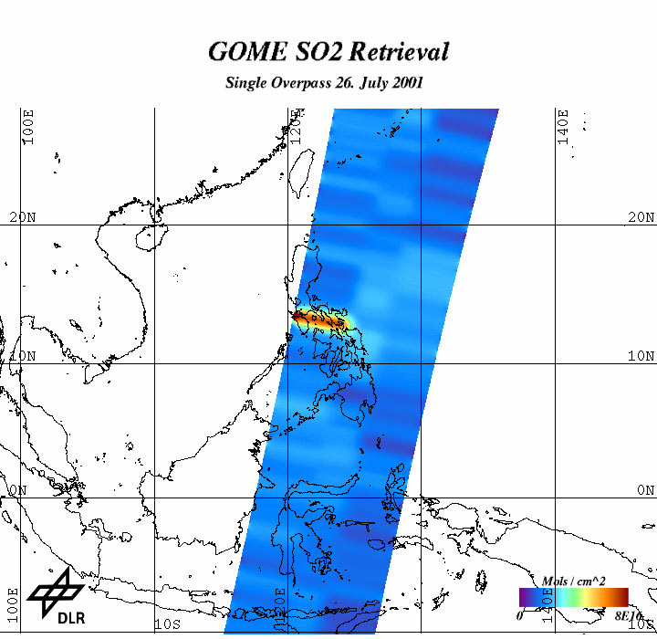 While Aetna was still in its eruptive phase, the notorious Majon volcano in the Philippines erupted again on 26 July 2001. Unlike Aetna, this volcano is far more dangerous for its immediate surroundings due to its explosive eruptions and is also capable of injecting significant quantities of sulphur dioxide into the upper troposphere and lower stratosphere.
