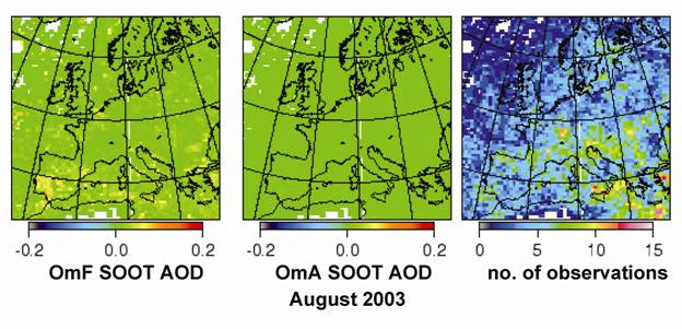 It builds on a mapping of aerosol classes used both in observation and model space taking their optical and chemical properties into account. Refractive indices for primary organic carbon particles, anthropogenic particles, and secondary organic species have been defined. Together with a treatment of different size distributions in observations and model state, this allows transforming the background from mass concentrations into aerosol optical depths. A two-dimensional, variational assimilation is applied for component-wise aerosol optical depths. Analysis fields are assessed threefold: (1) through validation against AERONET especially in Saharan dust outbreak situations, (2) through comparison with the British Black Smoke and Sulphur Dioxide Network for soot-containing particles, and (3) through comparison with measurements of the water soluble components SO4, NH4, and NO3 conducted by the EMEP (European Monitoring and Evaluation Programme) network. Separately, for the water soluble, the soot and the mineral dust aerosol components a bias reduction and subsequent a root mean square error reduction is observed in the analysis for a test period from July to November 2003. Additionally, examples of an improved analysis during wildfire and dust outbreak situations have been demonstrated.