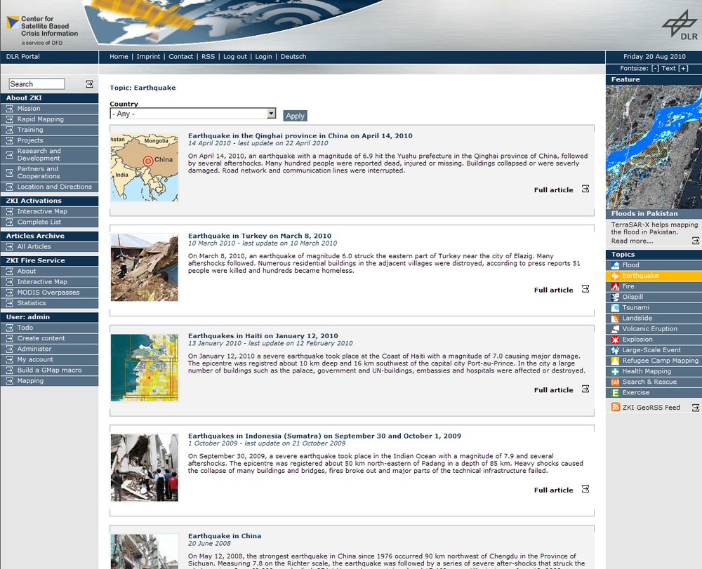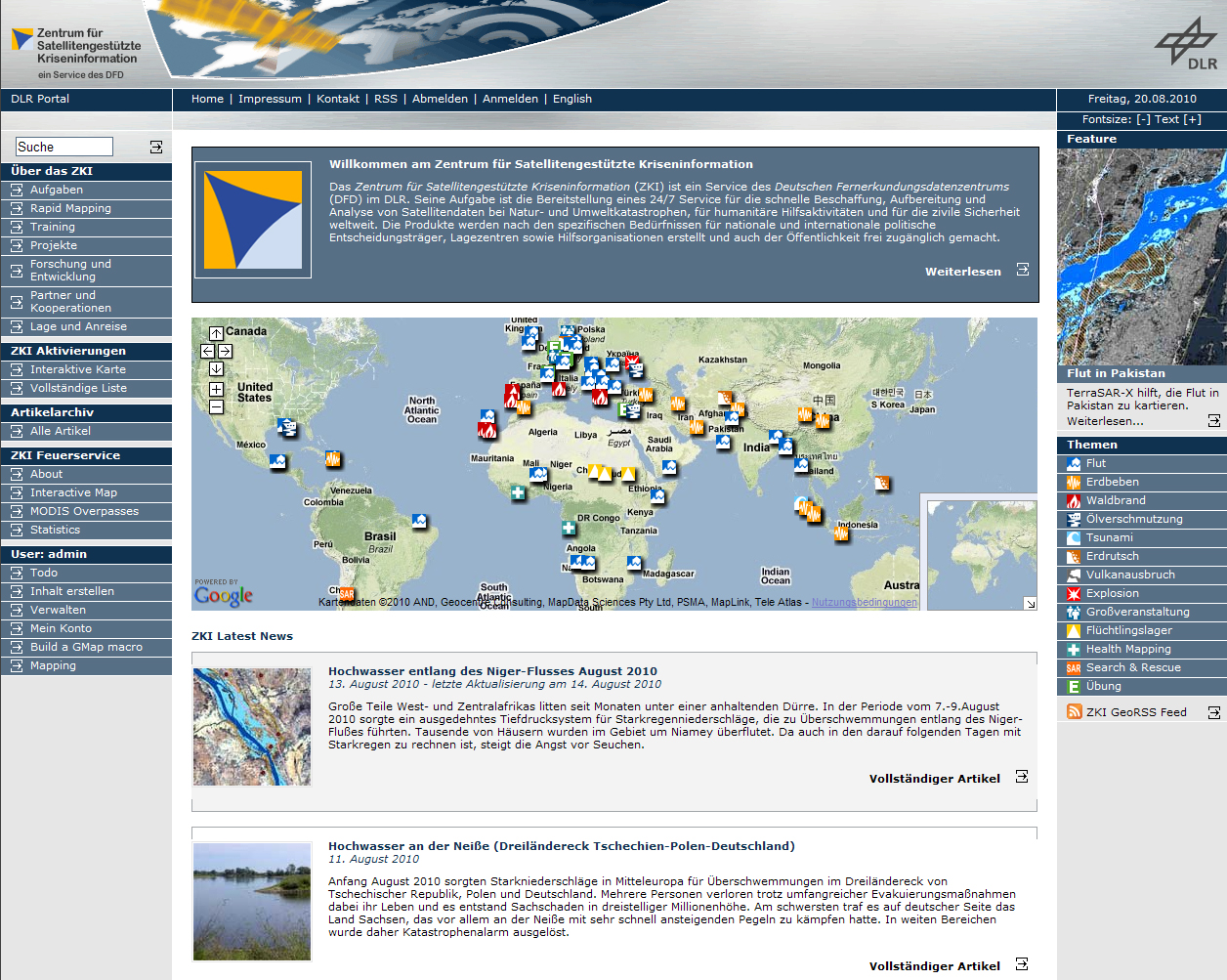 Today, Monday August 23, the Center of satellite based crisis information (ZKI) of DLR celebrates the relaunch of it’s web-portal. The old portal, that existed since the very beginning of this DLR service, has been fundamentally overhauled, both in visual and technical respect. It is offering now contemporary and comfortable access to the products of ZKI and to the information about recent activities and projects.