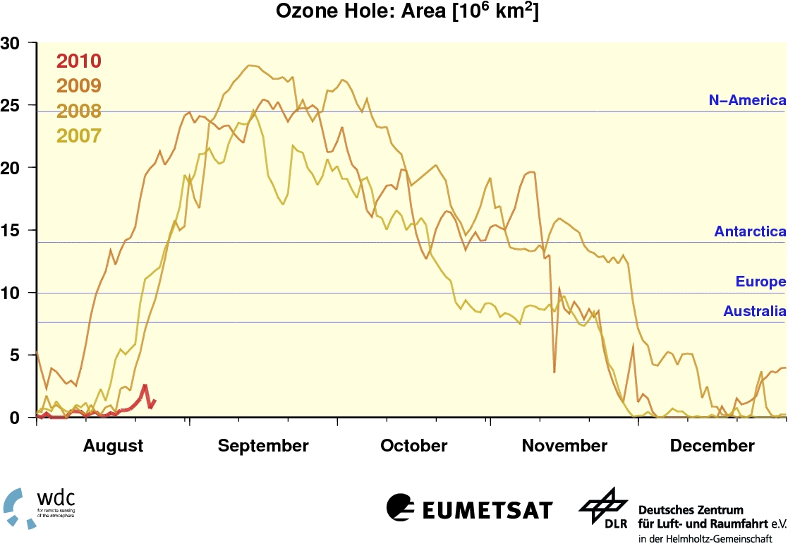 In the stratosphere above the respective winter pole (called “polar night”) a very cold vortex, the so-called polar vortex, develops due to missing insolation. Its huge wind speeds from 60 to 100 m/s, letting air parcels go around the pole within solely 5 to 7 days, act as a wall which hinders air-mass exchange from middle to polar latitudes. Inside the vortex the polar night leads to extremely cold temperatures of -80°C and below thus providing conditions for ozone depletion on a large scale: The polar boiler is quasi being preheated in preparation of the polar ozone hole. Eventually as the first sunlight appears in the ending polar winter the ozone-destroying chemistry is being launched. Up-to-date analyses of GOME-2 data, evaluated at DLR on a routine basis on behalf of EUMETSAT and assimilated at DFD into a 4D-Var-Model, lead to daily global charts revealing the latest extent of the polar ozone hole. Currently with a size of two to the million square meters the area covering the ozone hole is still relatively small. Within the next few weeks the area will increase many times over (see Figure 1).