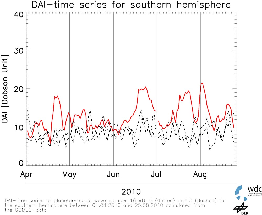 At the same time in DFD the activity of the planetary waves is being visualized daily using the so-called dynamical activity index (DAI) for the stratosphere of the respective hemisphere (see Fig. 3). In the weeks following it can be expected that dynamical activity will increase. It is only with the breakdown of the polar vortex that a changeover from winter to summer conditions will happen. In the southern hemisphere this typically happens in October.