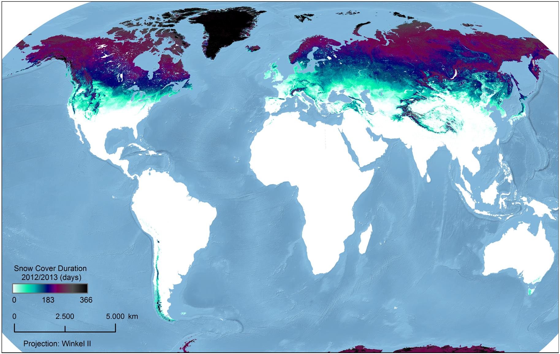 The “Global SnowPack” is a novel dataset containing information about snow cover parameters on a global scale. Begin, duration and melt of snow cover are included and allow detailed insights in the characteristics of this most relevant part of Earth’s cryosphere. The parameters are being derived from daily, operational MODIS snow cover products for every year. The negative effects of polar darkness and cloud coverage are compensated by applying several processing steps. Thereby, a unique global dataset can be provided that is characterised by its high accuracy, a spatial resolution of 500 meter and continuous future enhancements.