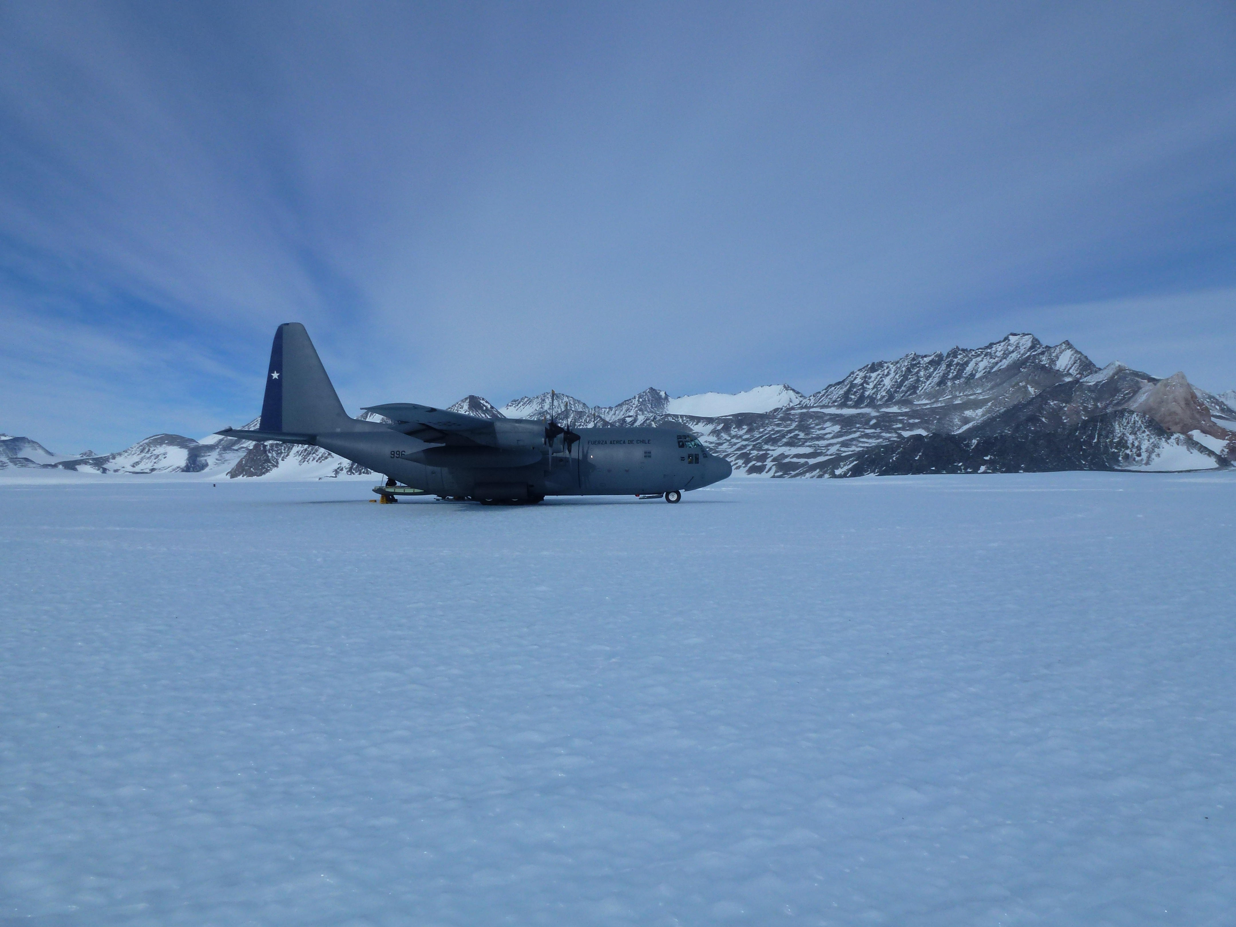 The landing of two C-130 Hercules transport aircraft on a blue ice runway launched the “hot” phase of a Chilean campaign on Union Glacier end of November 2016. The team consisting of South American scientists and members of the Chilean armed forces was joined by a scientist from the German Remote Sensing Data Center (DFD) “Antarctic junior scientists group”, which is financed by the DLR executive board. Under the leadership of University of Santiago, Chile (USACH) the reflectivity of sunlight (albedo) was measured and snow samples were collected. The high albedo in polar regions is an important factor influencing Earth’s global radiation balance.