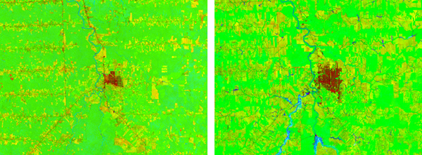 Some 500 terabytes of separate images condensed to a 20th of their original size can be analysed in the form of a single, global, cloud-free image. This is not simply a satellite image mosaic. Instead, the information content of the multispectral images was condensed as statistical ranges covering the entire recording period and taking into account the various spectral channels. Analysis of the land surface is possible based on indices for such aspects as the state of vegetation, water cover, or human settlement (built-up areas). For each of the recorded parameters the minimal, maximal and mean values were determined for the entire period from 2013 to 2015.