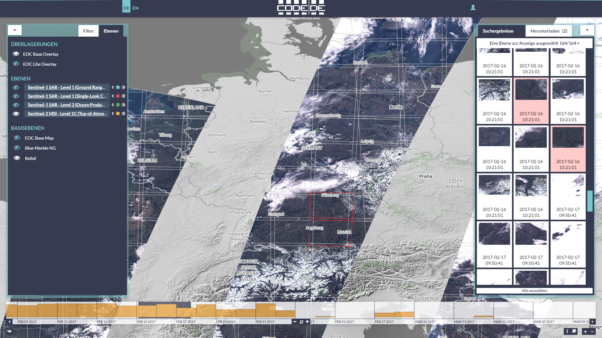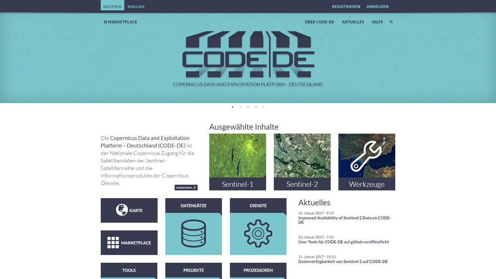 CODE-DE makes possible free-of-charge, simple access to data from the Sentinel satellites and to information products from the European Copernicus programme–including an up-to-date cloud-free mosaic of Germany, produced at EOC. The platform will also provide access to national geodata infrastructure (GDI-DE). This portal provides harmonised and standardised German geodata from a wide variety of sources. By agreement with industrial partners it is also planned to offer data from the German radar satellites TerraSAR-X and TanDEM-X as well as high-resolution optical images from RapidEye satellites.