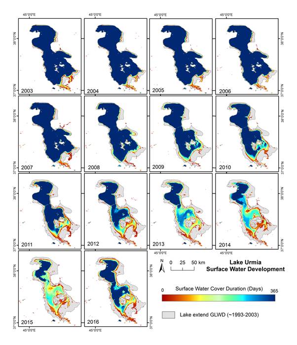 In 2003 Lake Urmia with its ca. 4250 km² had eight times the area of Lake Constance. Systematic analysis of global water surfaces at EOC shows that the lake had shrunk to about 10% of its original area by 2015, when just under 500 km² of the shallow lake was permanently covered with water. EOC obtains these data from Global WaterPack, a record of the daily fluctuations in the extent of water surfaces. The time-series analysis is based on data recorded by the MODIS sensor on the US satellites Terra and Aqua. This data product, developed by EOC scientists, makes possible daily monitoring of the global water body over the last 16 years at a spatial resolution of 250 metres. The depletion of Lake Urmia has already been reported in a number of science publications. But studies to date have only shown the size of the lake surface at discrete dates within a year, or as a mean value over longer periods, whereas there are strong seasonal variations. With Global WaterPack the drying out of the lake in its seasonal and spatial dynamics can be studied in detail. How does the lake react to natural fluctuations in rainfall and snowmelt? How much of the diverted water actually enters the lake? Do restoration measures have a long-term effect? These and other questions can be addressed in the future with the help of Global WaterPack.