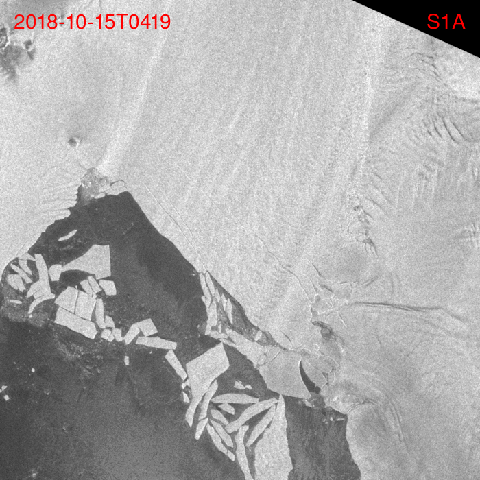 At the end of October 2018, another calving event took place at Pine Island Glacier, resulting in the iceberg B46 of 27 km length and 8 km width. The total length of the active calving zone is more than 40 km. This most recent event was observed with the aid of the European Radar satellites Sentinel-1A and -1B, which provide an important daily data source for polar research. These data are continuously processed and stored in the Processing and Archiving Center (PAC) of the German Remote Sensing Data Center (DFD) and are therefore available to scientists only a few hours after their acquisition.